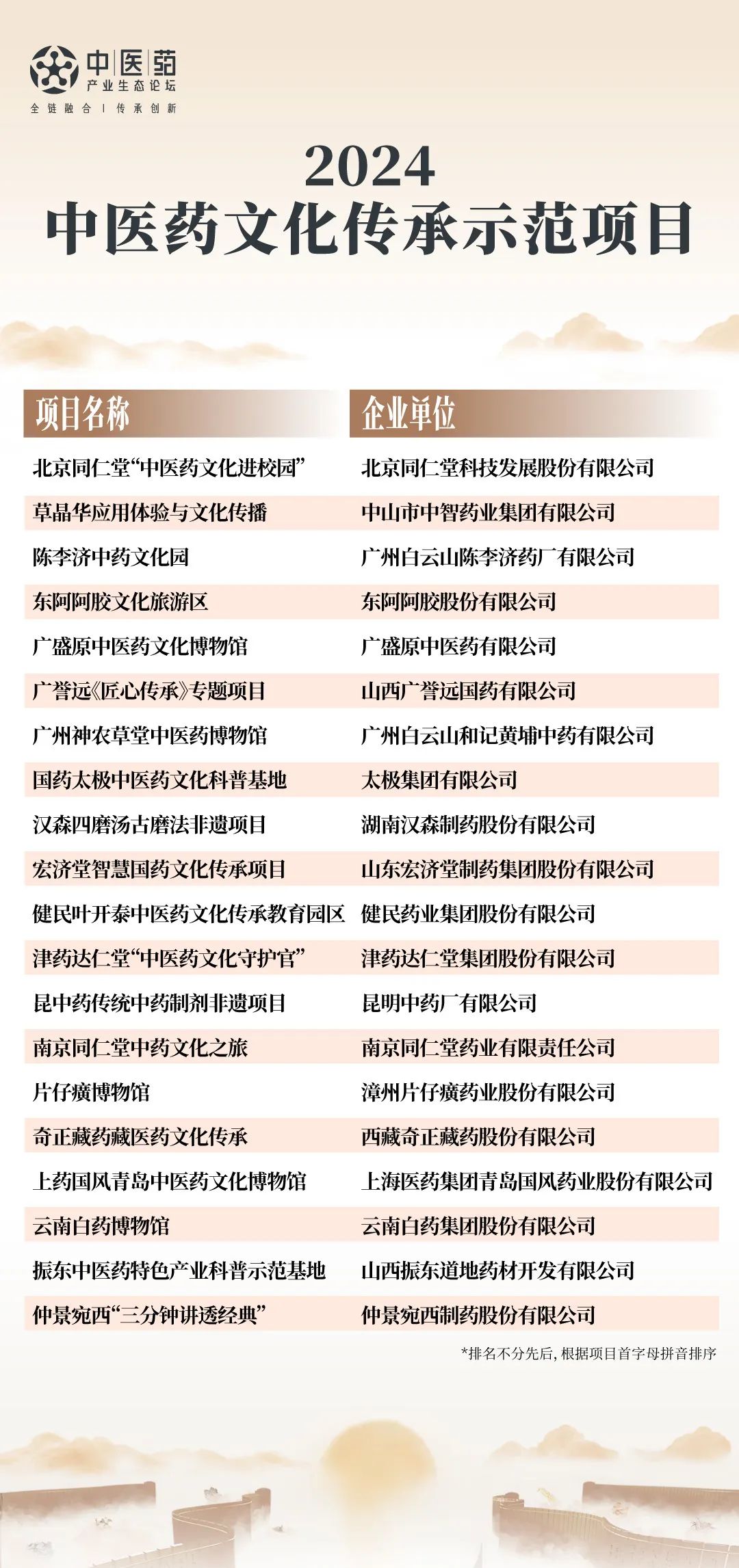 “2024中医药文化传承示范项目”活动旨在更好地表彰中医药企业在中医药传承方面所做的努力及成果,致力于展现和挖掘中医药的文化魅力与独特价值,树立中医药文化传承的实践标杆,为产业高质量发展打造了优秀的样板。此次中康科技产业研究院采用公开征集申报、公开投票和专家评审相结合的方式,聚焦企业在文化传承、传播普及、产业价值三大方向上的成果,优选出20个中国中药企业的文化传承项目,彰显中医药文化传承典范的榜样力量。