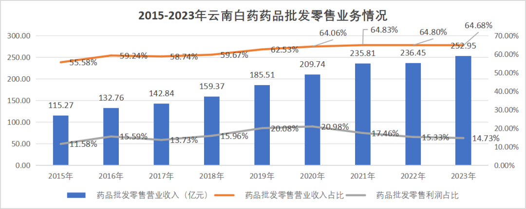 最典型的特征就是云南白药号称有着近400亿元的营收,但其中药品批发零售业务长期占比在65%左右。比如2023年云南白药公司整体营收391.11亿元,其中药品批发零售业务营收252.95亿元,占比64.68%。