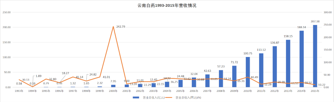 1993年云南白药成功上市,成为云南省第一家上市公司,并随之开启了规模体量一路狂奔的扩张旅程。年营业收入从1993年的0.58亿元一路飙升至2015年的207.38亿元,是当年的357倍。在这期间,云南白药营收无负增长,年度同比增幅只有7年低于20%,只有1年低于10%。