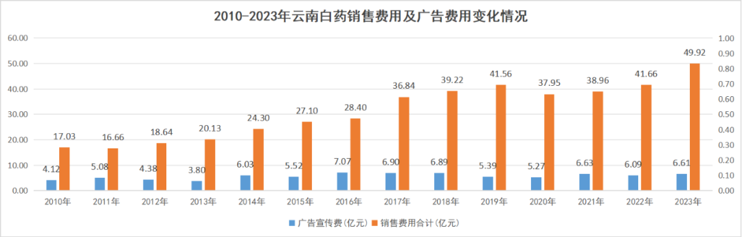 相关数据显示,从2010年到2023年,云南白药的销售费用从17.03亿元增长至49.92亿元。在2016年,云南白药7.07亿元的广告费成为该年份所有医药类上市公司中数额最大的。