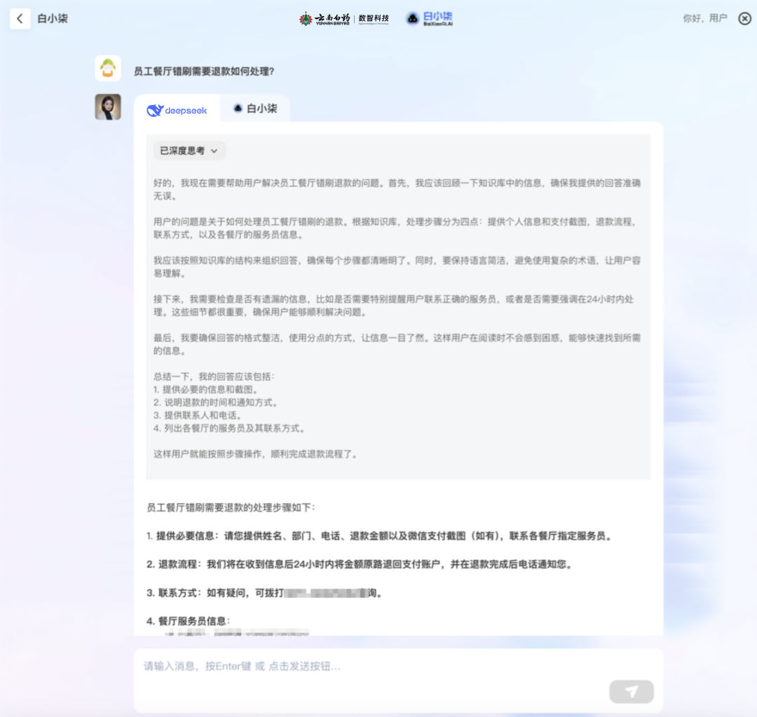 “白小柒”,作为企业内部数字员工,提供企业AI知识检索、智能问答等服务,通过本地化部署的DeepSeek全参版大模型,通过私有化部署和权限管理,实现了对敏感数据的有效隔离与保护。这一举措不仅确保了信息安全,更使得数据能够根据用户需求灵活流动,打造"数据不出域、运算不离场"的安全智能体系。