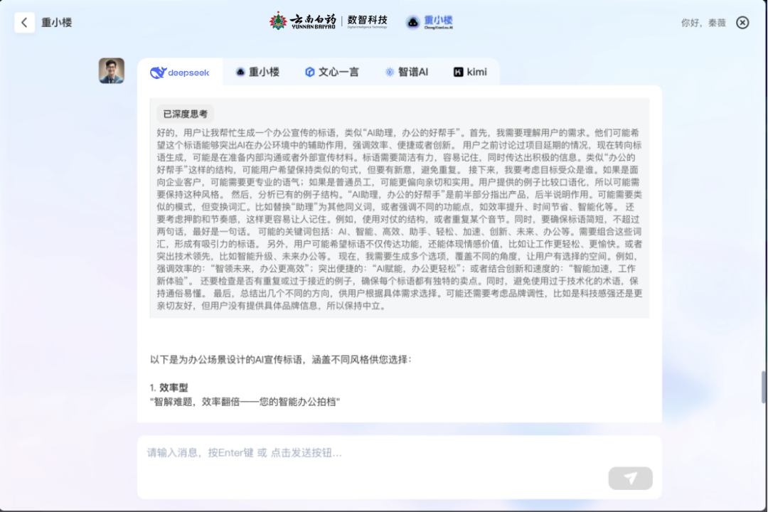 “重小楼”,作为企业开放型数字员工,继通义千问、文心一言、智谱清言及Kimi大模型之后,“重小楼”再度升级推理能力,接入DeepSeek大模型,展现出更强的适应性和创造力,为用户提供了一个跨模推理的新体验平台。