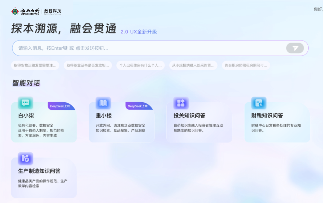 云南白药集团于2025年2月9日,结合工作实际,上线国产开源大模型 DeepSeek,依托企业级数字员工“白小柒”、“重小楼”及协同平台“白药钉”,加速中医药产业数字化升级。DeepSeek凭借行业领先的推理能力、完整的思维逻辑、卓越的模型性能以及多领域技术验证,为企业实现AI大模型全场景深度赋能。