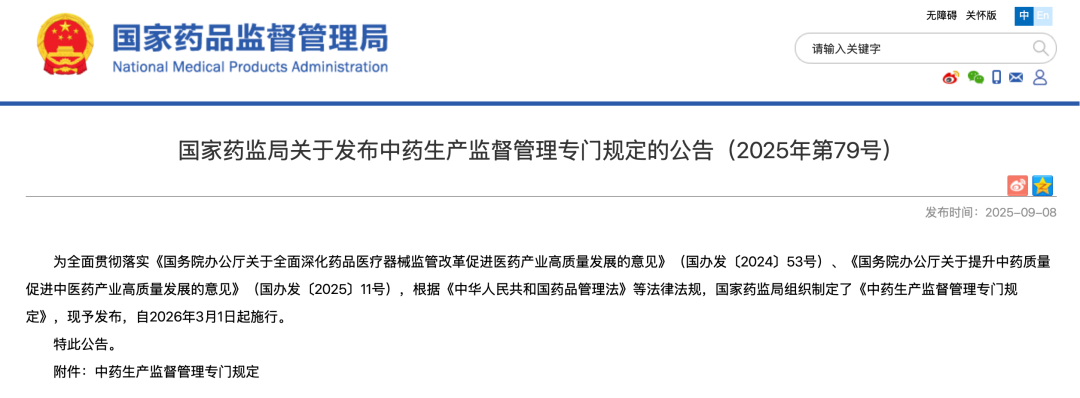 9月8日,国家药品监督管理局发布《中药生产监督管理专门规定》,侧重于提升中药材源头质量、加强中药生产全过程控制,值得一提的是,截至目前监管部门已连发八条《规定》相关政策解读,足见这份文件的分量。文件从加强下游中药生产企业的原料、生产、流通等方面的要求出发,对中医药产业链影响深远。