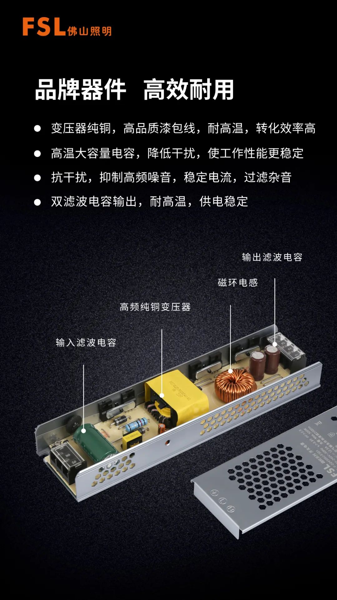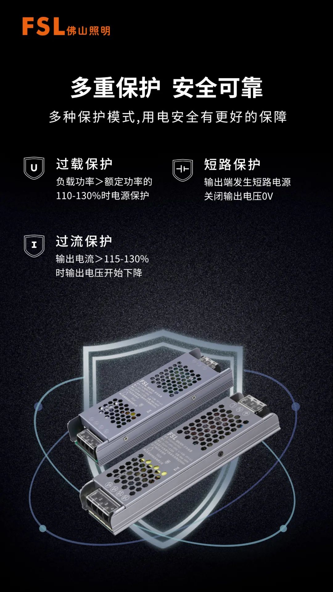 佛山照明“超炫”系列开关电源采用高品质元器件,具有耐温阻燃的特性。采用直流24V恒定电压稳定输出,有效保证负载使用寿命和安全性。产品设计采用“过载、过流、短路”三大电路保护机制,确保电源使用安全。