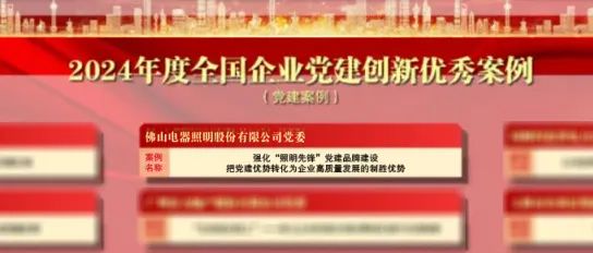 近日,2024年度全国企业党建(案例)研讨会暨第四届企业党建创新优秀案例发布仪式在京举办。佛山照明党委党建品牌案例《强化“照明先锋”党建品牌建设,把党建优势转化为企业高质量发展的致胜优势》从1800余家申报案例中脱颖而出,获评“2024年度全国企业党建创新优秀案例”。