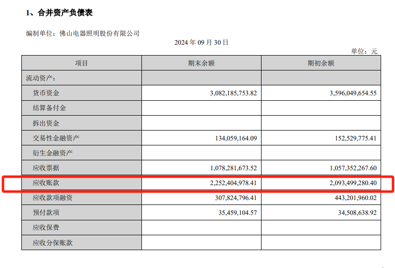 截至2024年9月30日,佛山照明应收账款期末余额为22.52亿元,期初余额为20.93亿元。应收票据期末余额为10.78亿元。