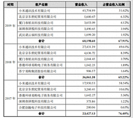 2014年,易来智能加入了小米生态链,为小米智能照明产品代工。随后,易来智能步入发展快车道。2017年-2019年,该公司分别实现营业收入3.07亿元、5.53亿元、8.86亿元,对应净利润分别为1457.06万元、2073.28万元、3451.82万元。同时期,小米一直是易来智能第一大客户,为其贡献了半数营收。