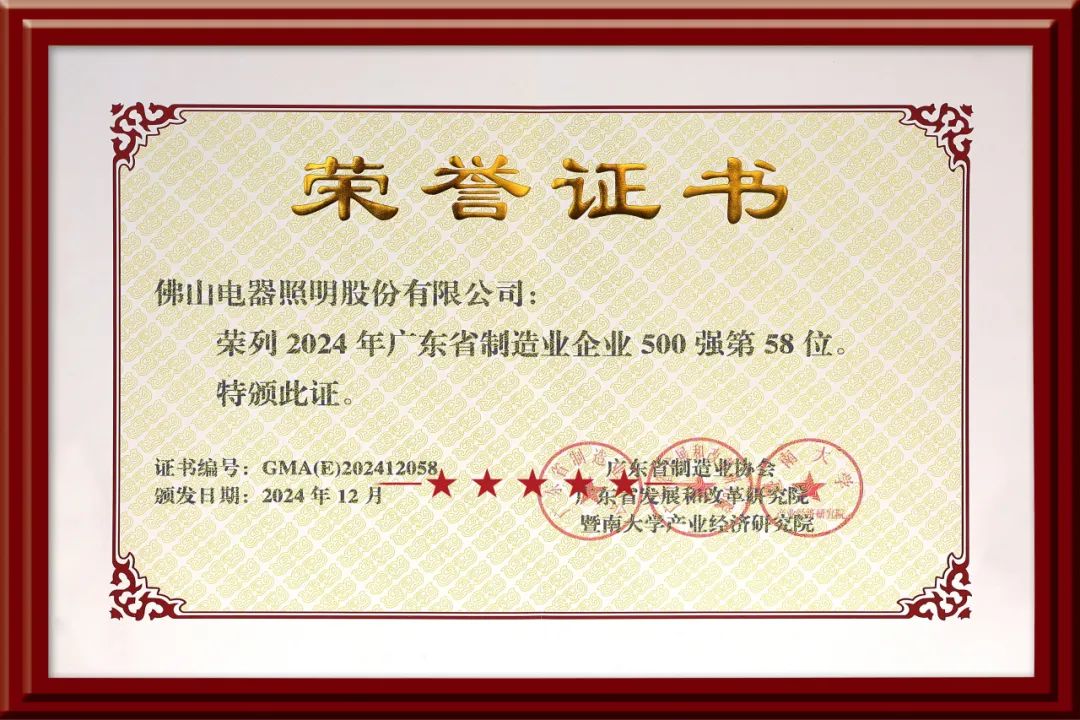12月3日,2024广东制造业500强企业峰会暨粤桂东西部协作广西崇左推介会在广州举办,会上发布了《2024年广东制造业500强企业研究报告》。佛山照明再次荣登“广东省制造业500强企业”榜单,排名第58位,较去年上升8位。