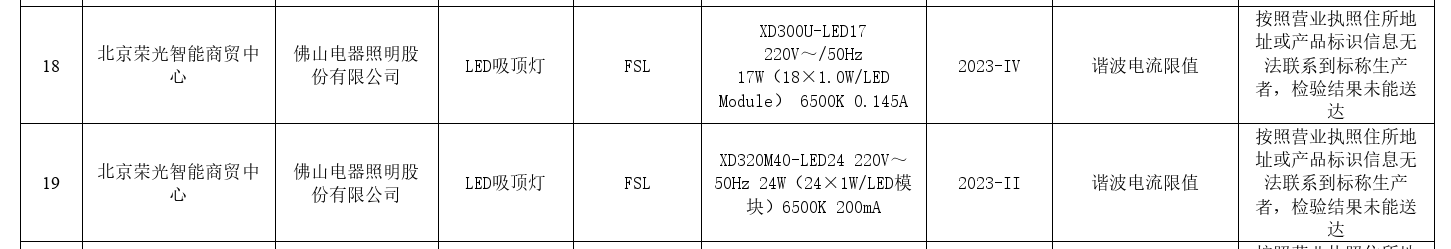 其中,标称佛山电器照明股份有限公司生产的LED吸顶灯产品抽检不合格。规格型号:XD300U-LED17220V~/50Hz17W(18×1.0W/LEDModule)6500K0.145A;生产日期/批号:2023-IV。