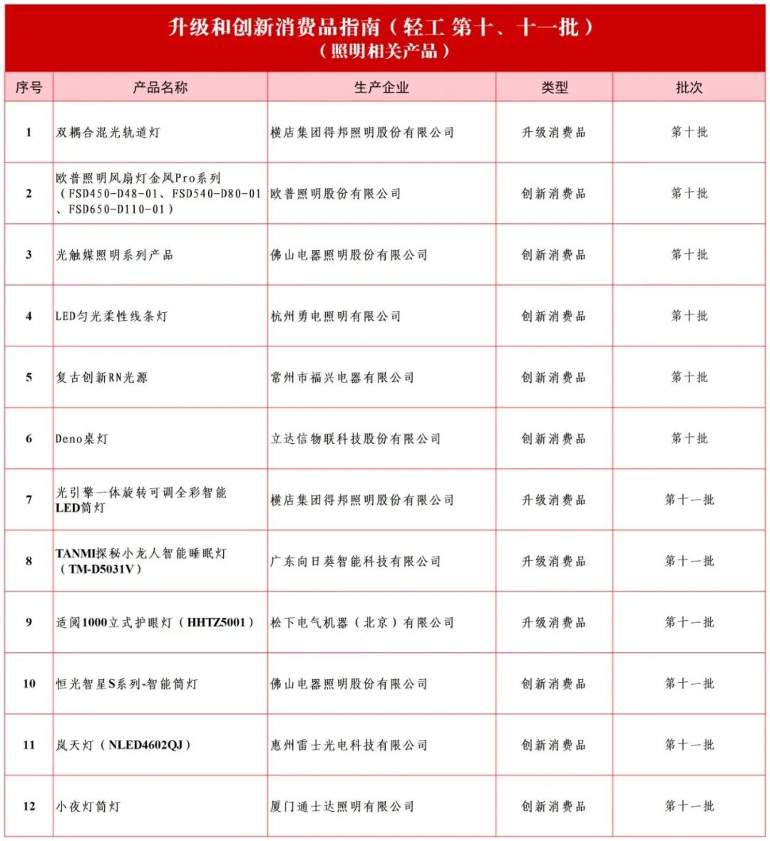 其中,得邦照明(共两款产品)、向日葵智能、松下电气的产品入选升级消费品(指质量稳定可靠、性能优良、能引领消费趋势的高品质消费品);欧普照明、佛山照明(共两款产品)、立达信、雷士、通士达、勇电照明、福兴电器的产品入选创新消费品(指采用新材料、新工艺或新设计,具有独特功能或使用价值的消费品)。