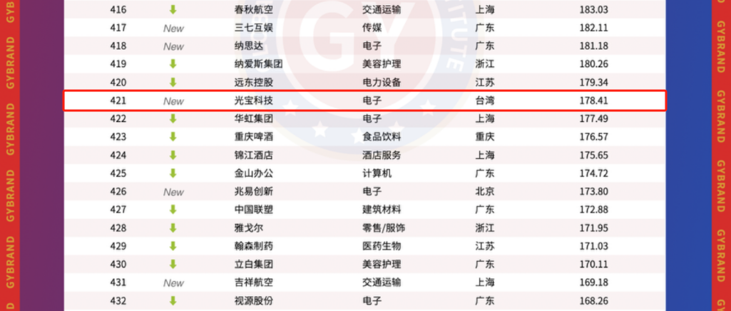 光宝科技以品牌价值178.41亿元,排名421。创立于1975年,台湾LED产业先驱,也是台湾首家上市电子公司的光宝科技,以先进的光电半导体与电源管理实力立基全球,近年积极布局云端运算电源、汽车电子、光电半导体、5G AIoT。光宝科技表示,未来将以绿色数据中心、永续运输、高效能基础设施作为中长期发展的成长引擎。