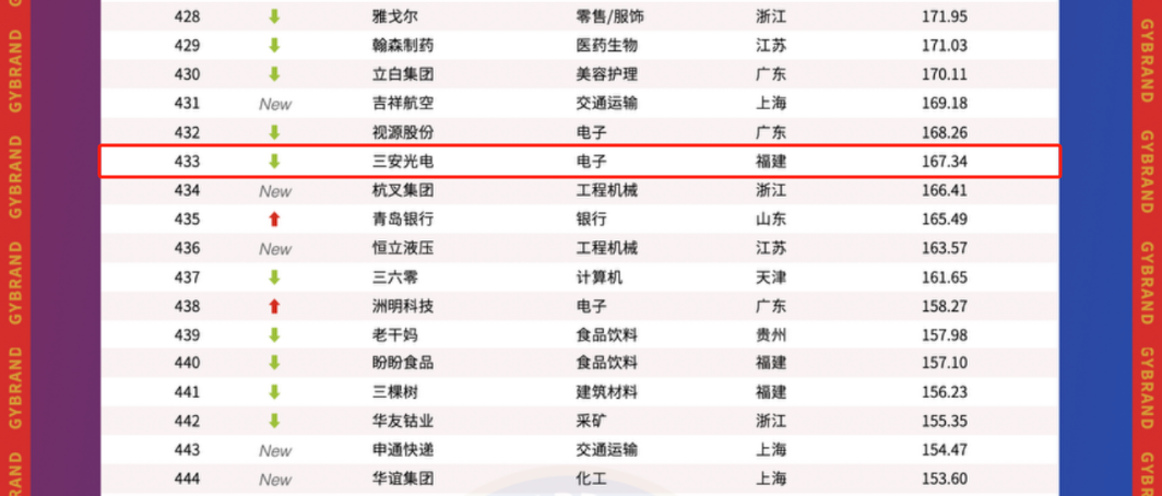 三安光电以品牌价值167.34亿元,排名433。三安光电成立于2000年,2008年在上海证券交易所挂牌上市,主要从事半导体新材料、外延、芯片与器件的研发、生产与销售,在美国、日本、德国、英国、新加坡等全球多个国家均建立起分支机构,其产品广泛应用于照明、显示、背光、Mini/Micro、红外感测、植物照明等多个领域。