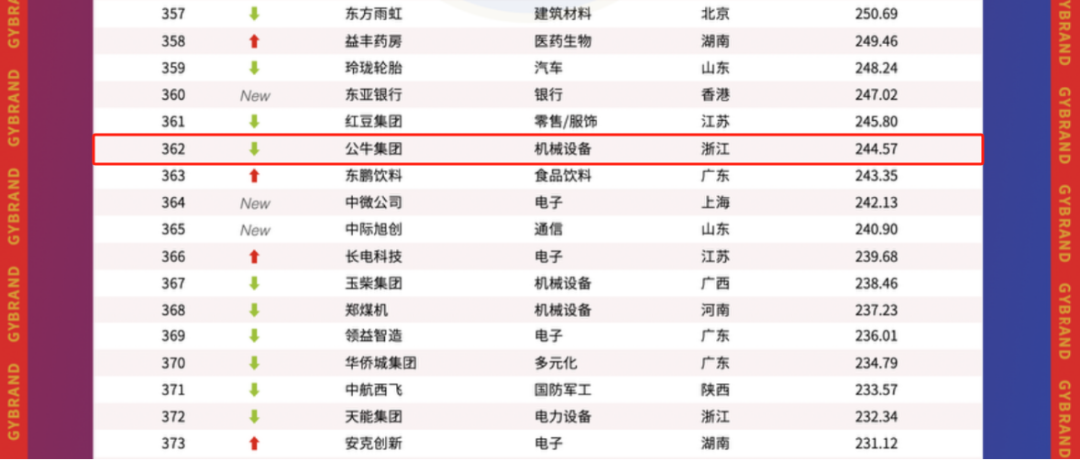 公牛集团以品牌价值244.57亿元,排名362。公牛集团,成立于1995年,于2020年在上交所挂牌上市。三十年来,公牛集团深耕民用电工领域,秉持“专业专注、走远路”的经营理念,逐步形成了电连接、智能电工照明、新能源三大主营业务,并围绕民用电工及照明领域形成了长期可持续的产业布局。