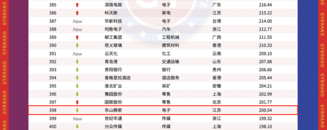 东山精密以品牌价值200.54亿元,排名398。始创于1980年的东山精密,于2010年4月在深交所挂牌上市。东山精密致力于为智能互联互通的世界研发、制造技术领先的核心器件,业务涵盖印刷电路板、触控面板及LCM模组、LED器件和通信设备组件等,产品广泛应用于消费电子、通信、工业设备、汽车、AI、医疗器械等行业。