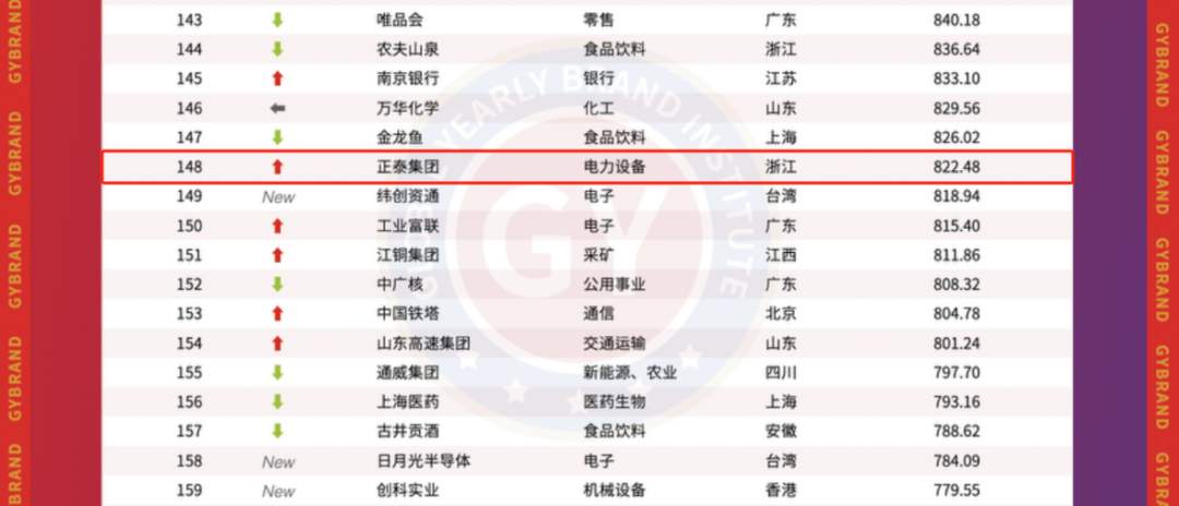 正泰集团以品牌价值822.48亿元,排名148。正泰始创于1984年,是全球知名的智慧能源系统解决方案提供商。创立40年来,正泰始终聚精会神干实业、一门心思创品牌,深入践行“产业化、科技化、国际化、数字化、平台化”战略举措,形成了“绿色能源、智能电气、智慧低碳”三大板块和“正泰国际、科创孵化”两大平台,其旗下正泰电器为中国首家以低压电器为主营业务的A股上市公司。