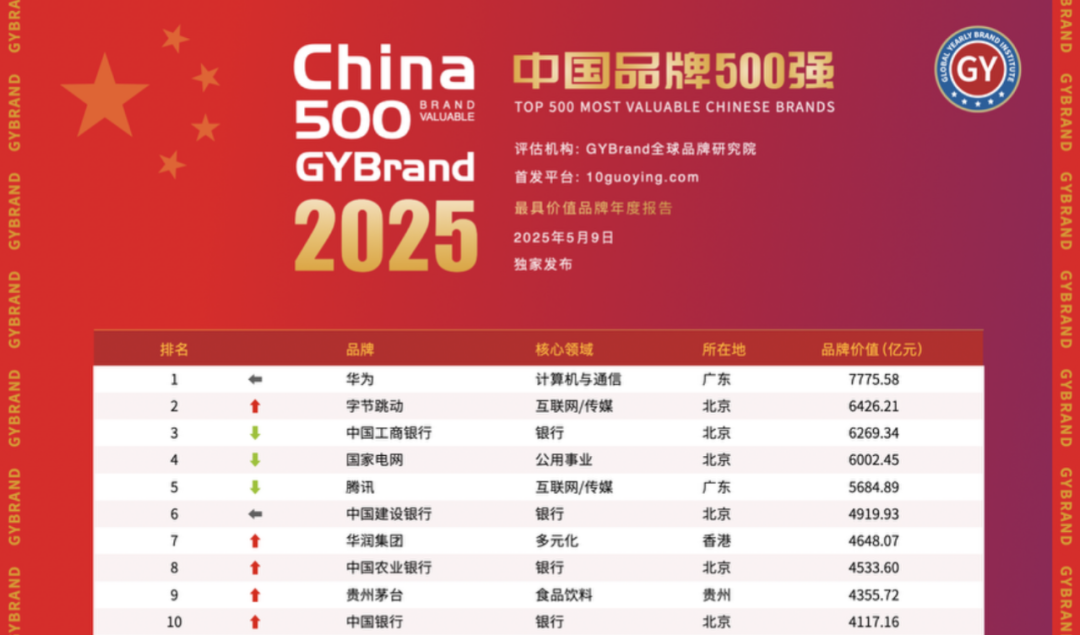 5月9日,GYBrand全球品牌研究院编制的2025年度中国最具价值品牌500强排行榜正式发布。这是一份全面展示中国品牌高质量发展最新成果的榜单,其主要评估依据是品牌价值,不是简单按照企业市值或营收规模排序,而是从财务业绩、品牌强度、品牌贡献、可持续性等多个维度进行综合分析。