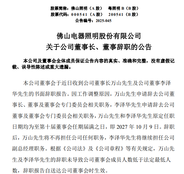今日(9月28日),佛山照明(000541)发布公告称,公司董事会于近日收到董事长万山的书面辞职报告。