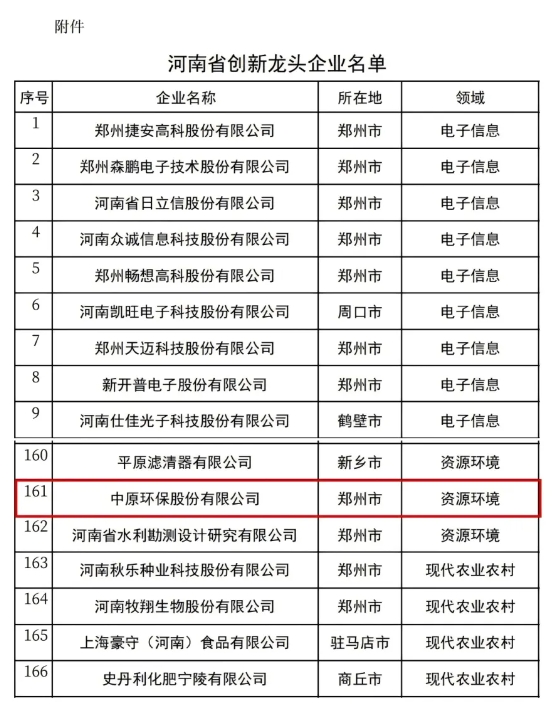 河南省创新龙头企业是聚焦河南省重点产业链发展需求,以国家高新技术企业为重点,从全省重点产业领域遴选培育出的核心竞争力强、行业带动性大、综合实力和创新能力居全省前列的创新型企业。本次创新龙头企业遴选由省科技厅、省发展改革委、省财政厅、省税务局共同组织,经企业申报、地市推荐、专家评审、会议研究等程序,遴选了166家河南省创新龙头企业。本次遴选,中原环保获评资源环境领域创新龙头企业。