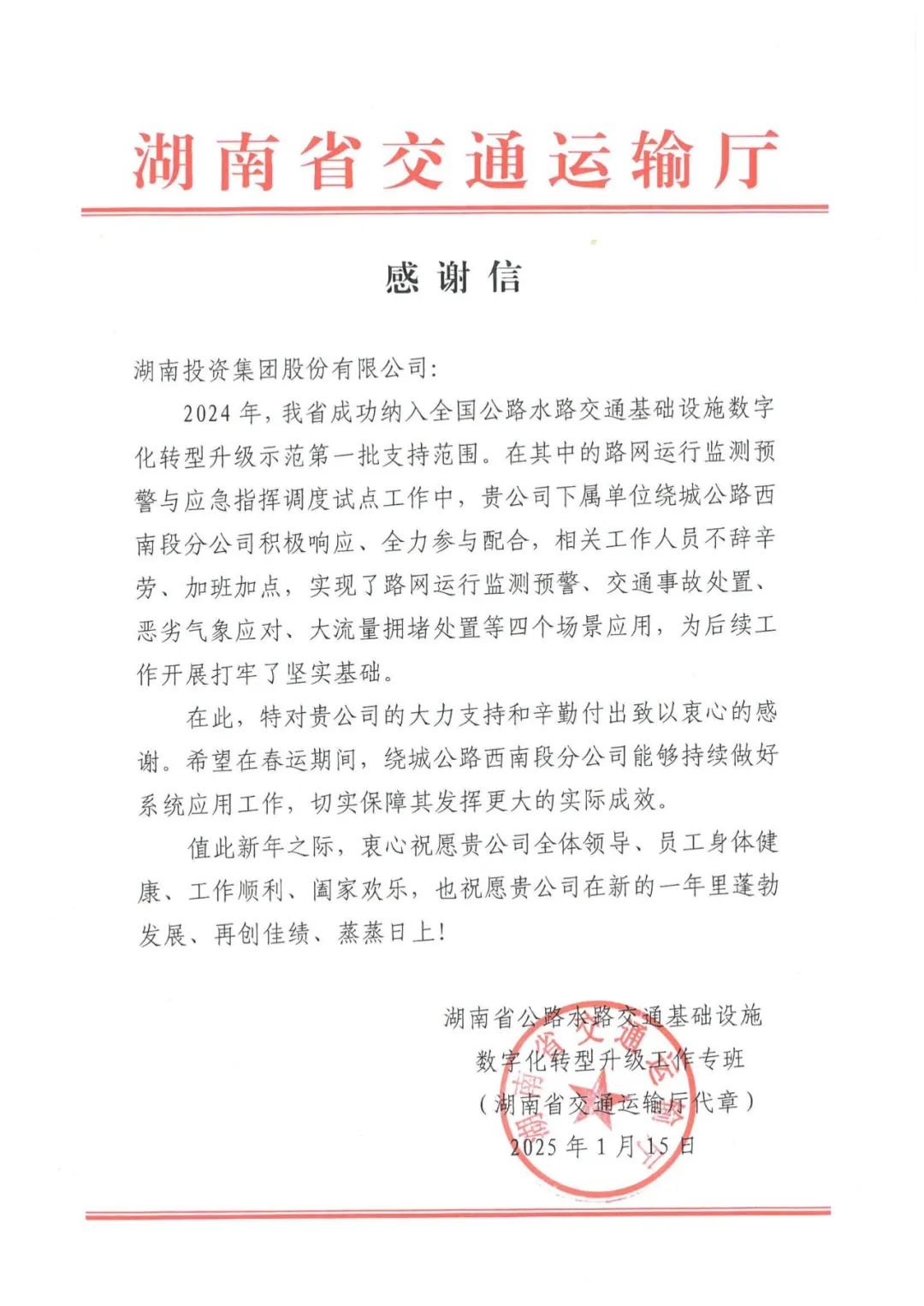 近日,湖南投资集团收到一封来自湖南省交通运输厅公路水路交通基础设施数字化转型升级工作专班的感谢信,信中工作专班对2024年度湖南投资集团绕南高速“路网运行监测预警与应急指挥调度试点工作”给予了高度评价。