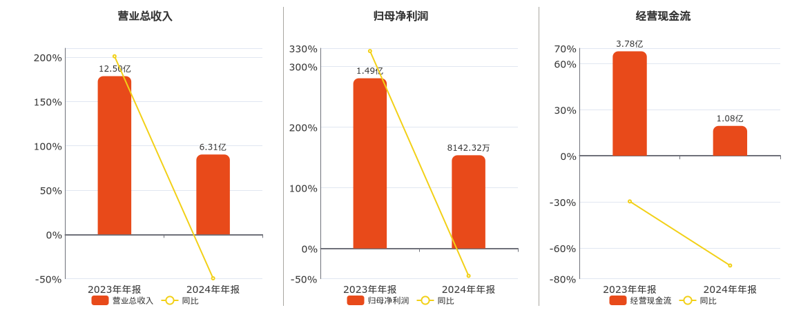 公司营业总收入为6.31亿元,较去年同报告期营业总收入减少6.19亿元,同比较去年同期下降49.50%。归母净利润为8142.32万元,较去年同报告期归母净利润减少6728.15万元,同比较去年同期下降45.25%。经营活动现金净流入为1.08亿元,较去年同报告期经营活动现金净流入减少2.70亿元,同比较去年同期下降71.38%。