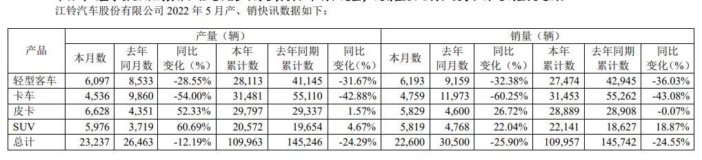 证券时报e公司讯,江铃汽车(000550)6月7日晚间公告,5月销量22600辆,同比下降25.90%。