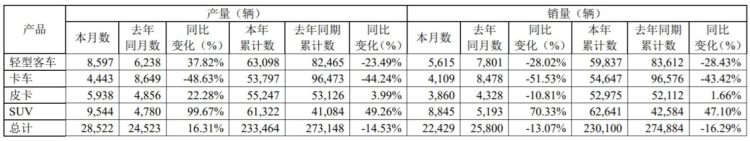 当月产量为2.85万辆,同比增长16.31%;销量为2.24万辆,同比下降13.07%。2022年1-10月,累计产量为23.35万辆,同比下降14.53%;累计销量为23万辆,同比下降16.29%。