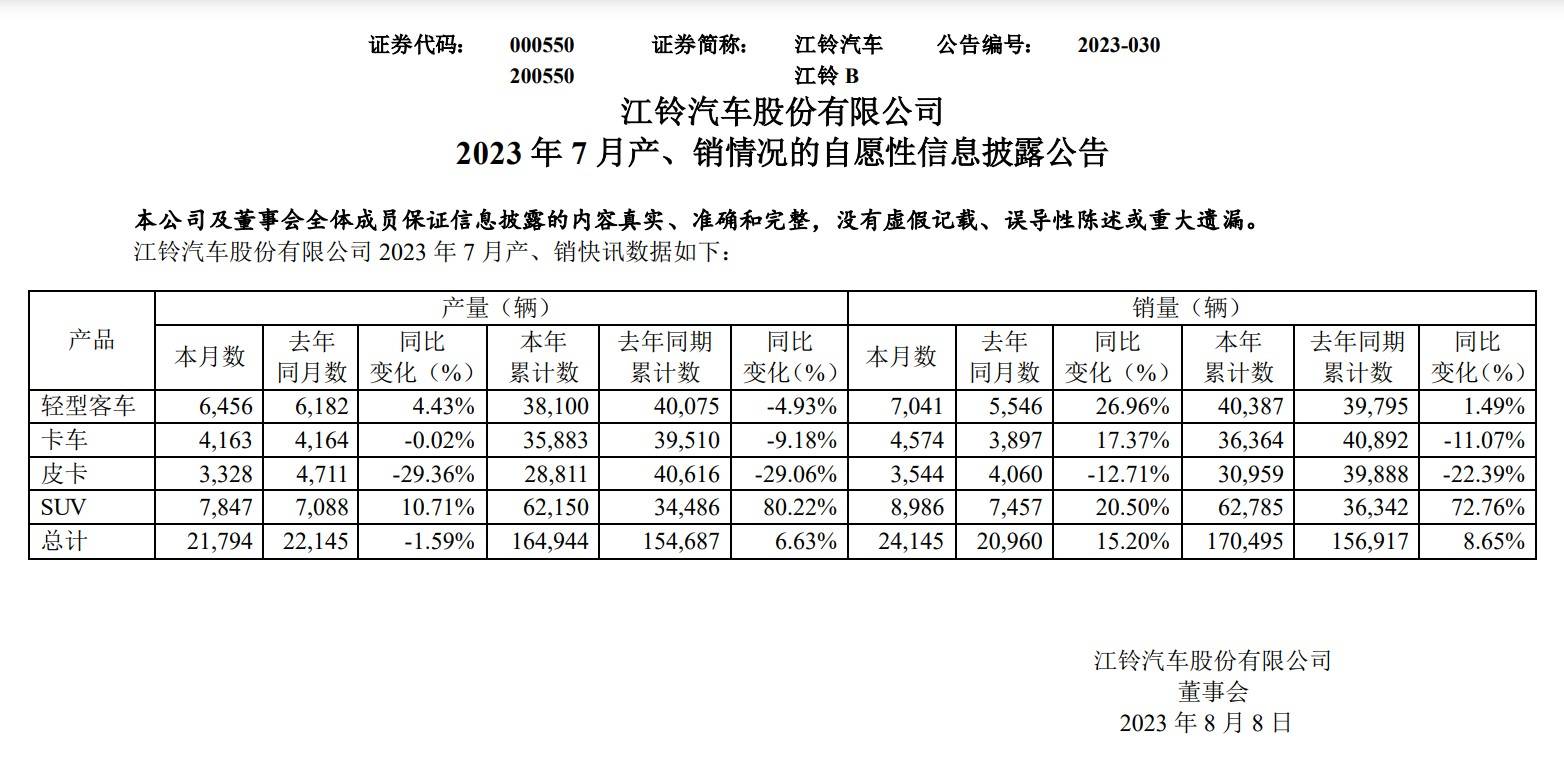2023年8月8日,江铃汽车股份有限公司(以下简称“江铃汽车”)发布2023年7月产销情况的自愿性信息披露公告。公告显示,2023年7月,江铃汽车销量为24,145辆,同比增长15.20%;2023年1-7月累计销量为170,495辆,同比增长8.65%。
