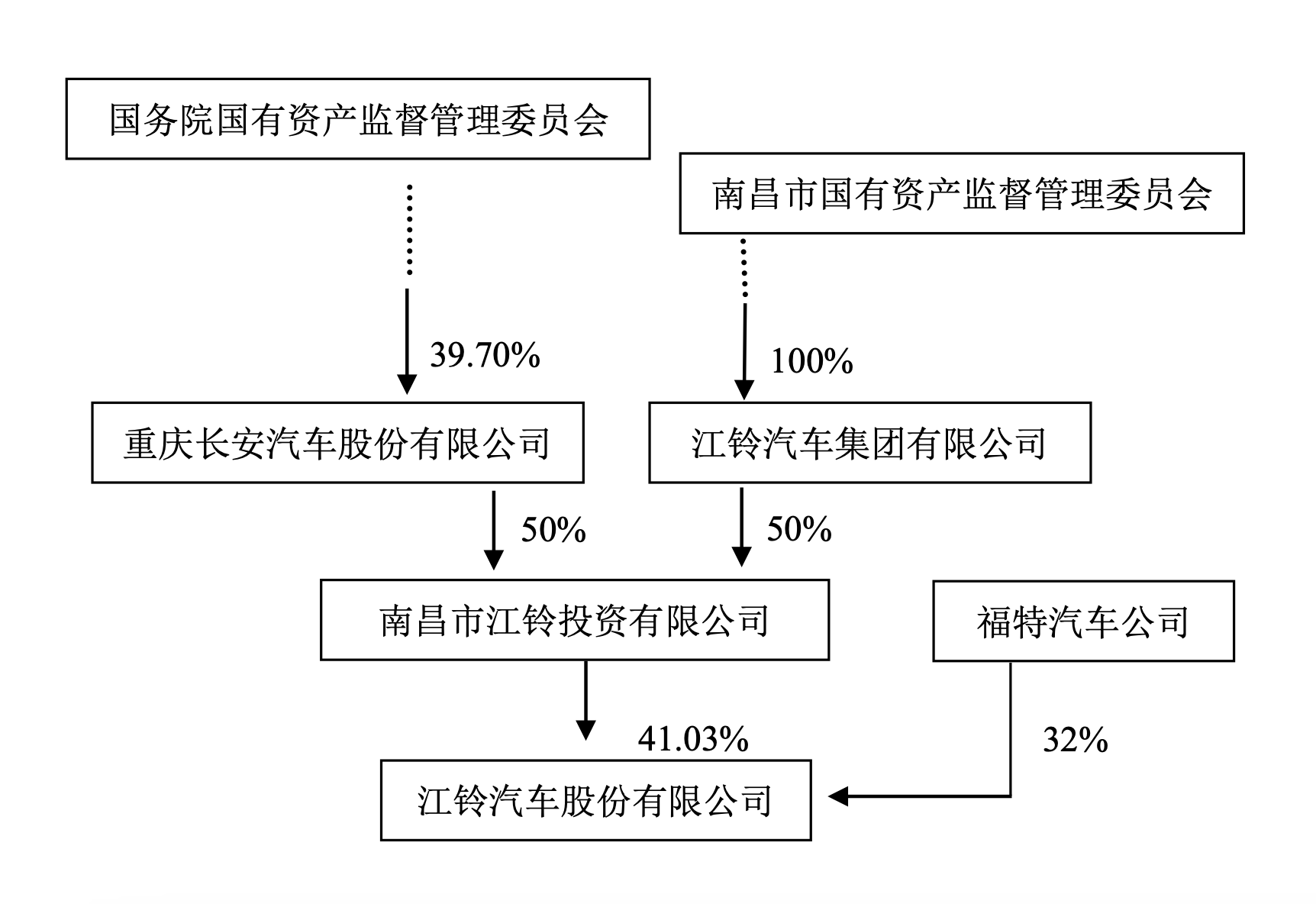 江铃福特是江铃汽车旗下合资品牌。江铃集团与长安汽车各持50%股权的南昌市江铃投资有限公司,持股江铃汽车41.03%;福特汽车在江铃汽车的持股为32%。江铃集团为南昌市国资委全资控股国企,长安汽车实际控制人为国务院国资委。