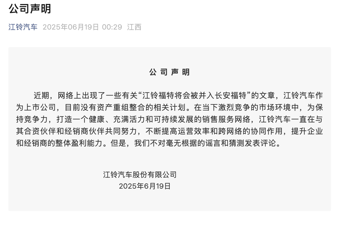 6月19日凌晨,江铃汽车(000550.SZ)发布公告,否认旗下合资品牌江铃福特将并入长安福特。公告称:近期,网络上出现了一些有关“江铃福特将会被并入长安福特”的文章,江铃汽车作为上市公司,目前没有资产重组整合的相关计划。