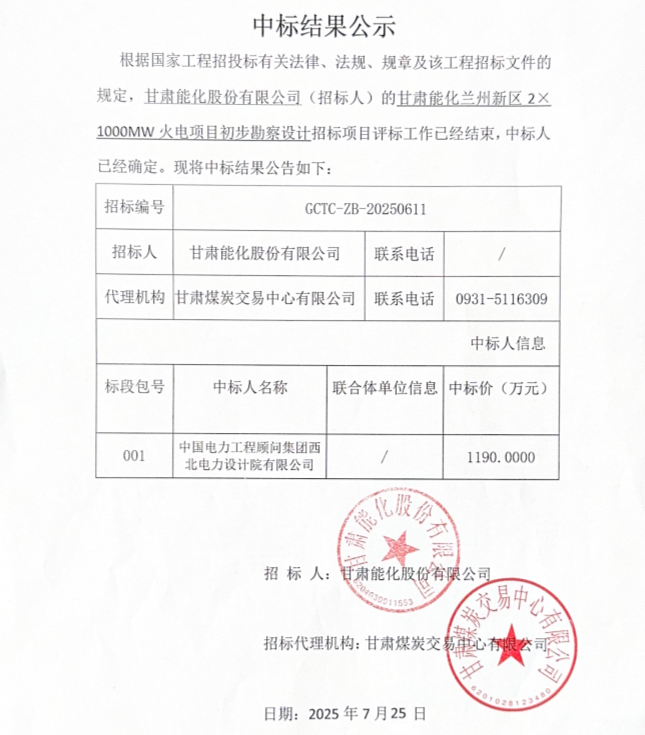 7月25日,甘肃省公共资源交易中心发布甘肃能化兰州新区2X1000MW火电项目初步勘察设计中标结果公示,详情如下: