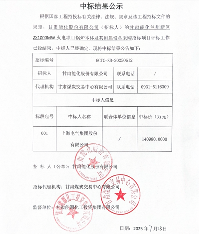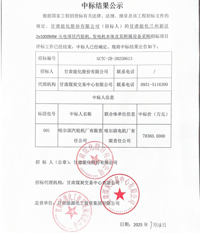7月28日,甘肃省公共资源交易中心发布甘肃能化兰州新区2X1000MW火电项目三大主机设备中标结果公示,详情如下: