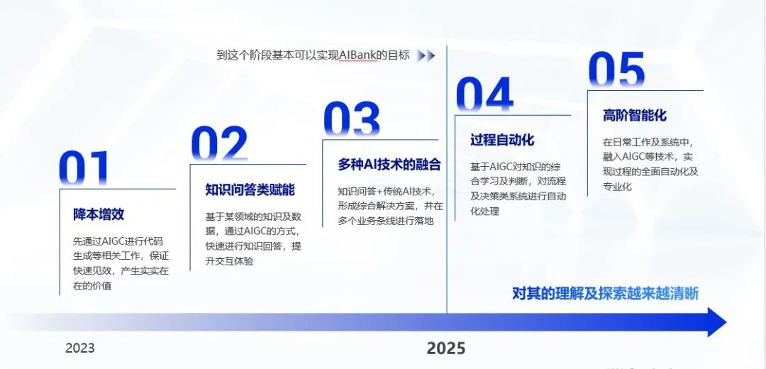 薛春雨表示,大模型在金融行业的落地需要体系化的路径,神州信息制定了AIGC五步走战略。首先,通过AIGC降本增效、知识问答类赋能和多种AI技术在业务场景中的融合,通过快速的价值显现,为AIBank战略目标转型夯实基础;其次,在后续的过程中,持续推动自动化和高阶智能化发展,最终实现金融行业的全面智能化。