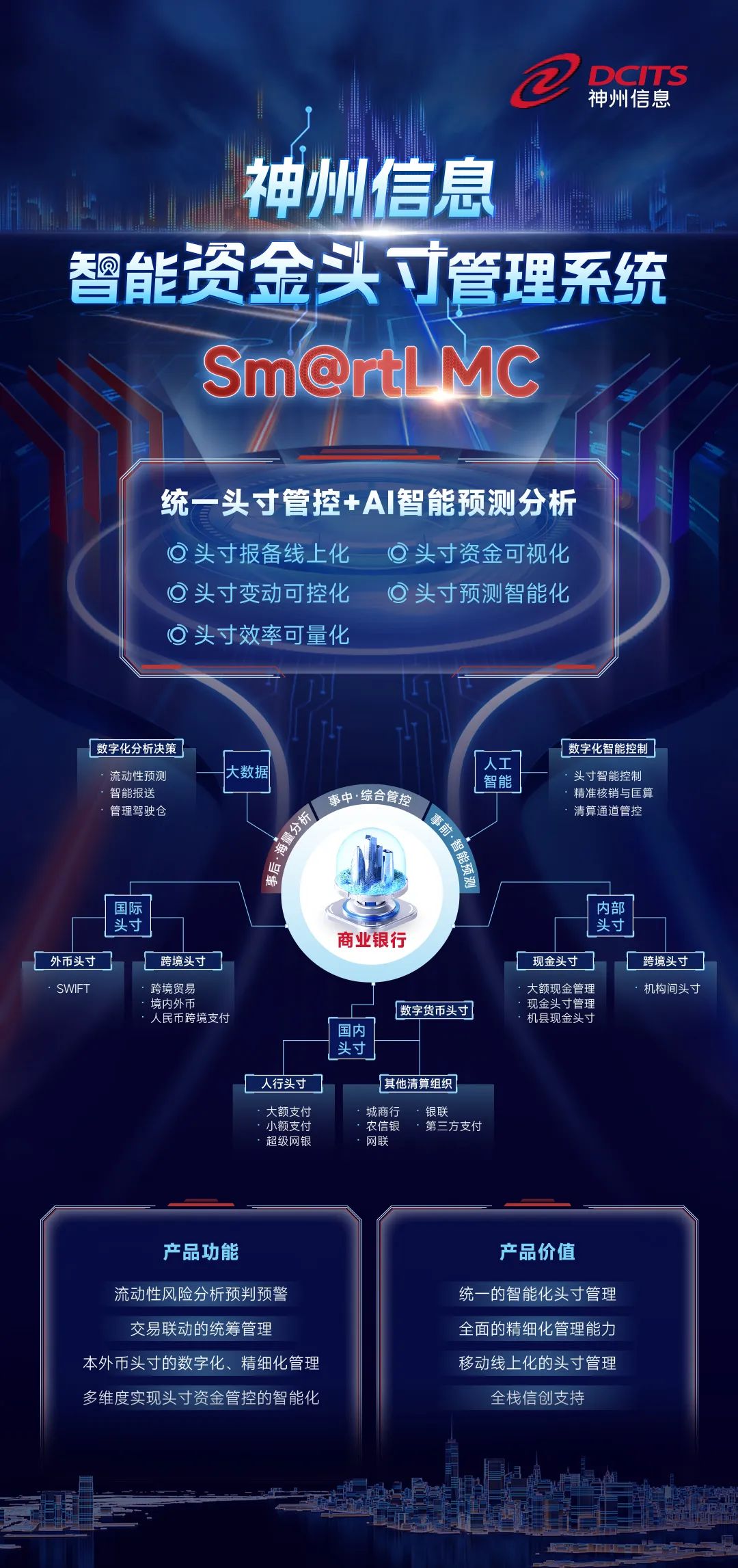 近期,神州信息智能资金头寸管理系统Sm@rtLMC连续签约华夏银行及江苏、南京和重庆等地四家商业银行的智能流动性头寸管理平台项目。通过AI技术和多模型算法相结合,帮助银行打造集“预测+管控+分析”为一体的智能化资金头寸管理能力,改变传统管理模式,降本增效,有效提升银行对流动性资金的利用效率。同时,通过分析预判预警、交易联动统筹管理、本外币头寸一体化等功能,实现对流动性风险管控能力的提升。