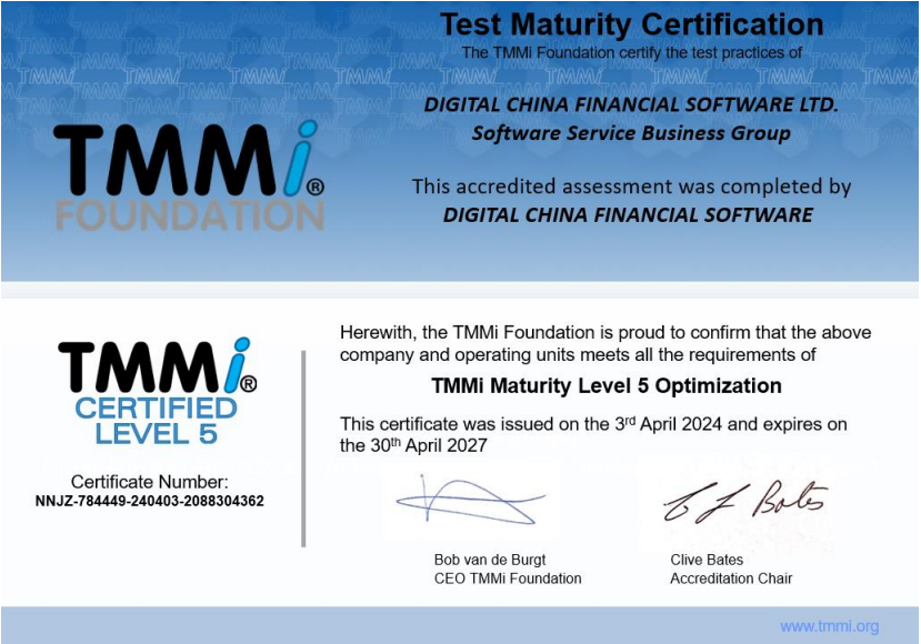近日,神州信息子公司——神州数码融信软件有限公司(下文简称“神州数码融信”)通过TMMi(测试能力成熟度模型集成)最高级别5级国际权威认证,成为国内同时获得TMMi5级认证和CMMI5级认证的企业,覆盖咨询、产品需求、软件开发、测试、运维全流程的IT软件研发及服务。