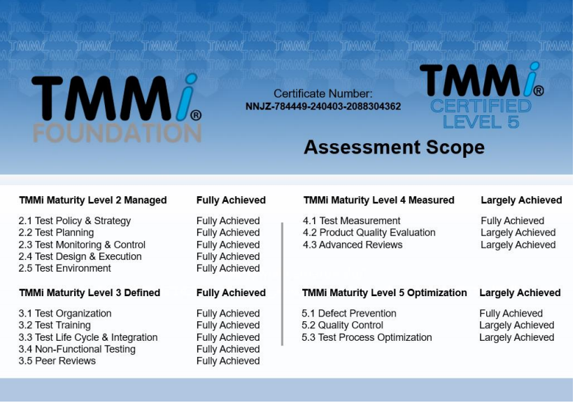 在本次TMMi5级认证过程中,神州信息咨询认证团队依据TMMi基金会推荐使用的IDEAL模型,进行了差距分析、体系优化建模、项目试点、预评估与正式评估等一系列改进和认证评估工作。TMMi咨询评估团队经过客观、认真细致而全面的评估,一致确认神州数码融信在TMMi高成熟度方面表现出业界专业水平,完全符合TMMi5级的16个过程域标准。