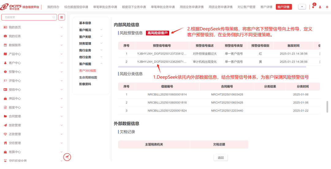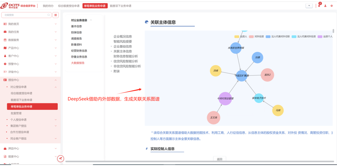 神州信息通过接入国产开源大模型DeepSeek,成功研发“智能综合信贷系统”。该系统依托DeepSeek大模型的强大能力,实现了多模态解析、动态建模与实时预警等能力提升,从而对信贷业务全流程进行精准决策与效率跃升。在具体应用中,系统重点聚焦于“非标数据转化、供应链交易验证、软信息量化、行业风险监控、客户画像精准营销”五大场景,并在这些领域实现了突破性进展。