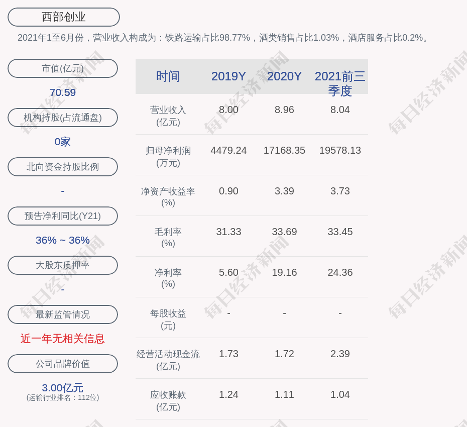 2021年1至6月份,西部创业的营业收入构成为:铁路运输占比98.77%,酒类销售占比1.03%,酒店服务占比0.2%。