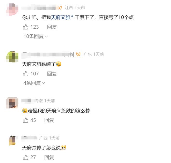 目前天府文旅已经两个跌停。有股民怒骂:真的想骂人了,什么消息都没有,我连吃两个跌停,别叫天府了,直接地府吧。后面网友留言:王姐去成都旅游了,去之前还点名了天府文旅,前天已经给了大家逃跑的机会,狗庄算善良了。