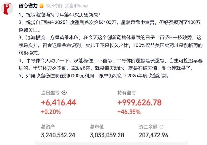 今日则更为疯狂,祝贺自己账户2025年首次突破100万;祝贺了泡泡,自夸自己持有的百济;此外,对于持有的半导体大涨,他表示:半导体起来了?那我无敌了,没有任何弱点了。