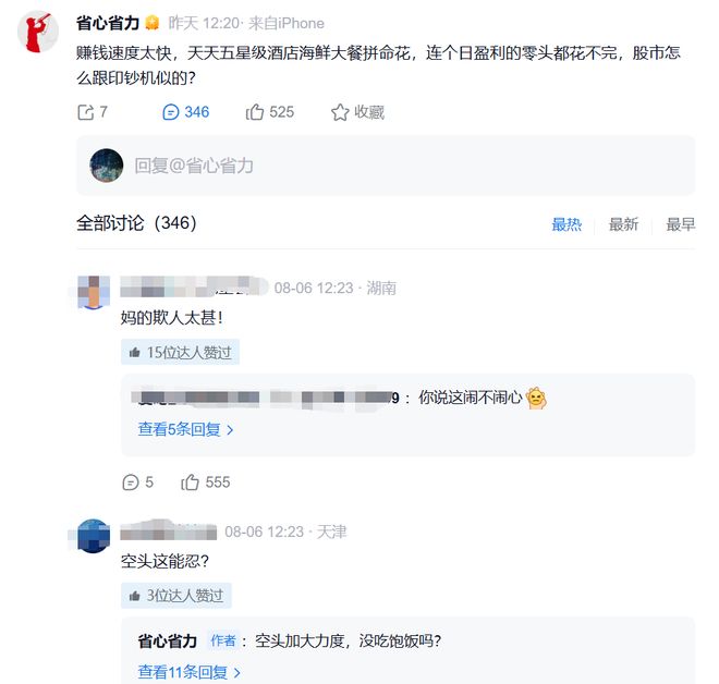 还有知名雪球大v省心省力最近明显开心的睡不着。昨日他直接表示赚钱速度太快,股市就是印钞机:赚钱速度太快,天天五星级酒店海鲜大餐拼命花,连个日盈利的零头都花不完,股市怎么跟印钞机似的?