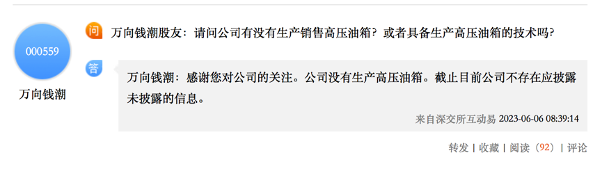6月6日,有投资者在投资者互动平台向万向钱潮(000559.SZ)董秘提问:“请问公司有没有生产销售高压油箱?或者具备生产高压油箱的技术吗?”