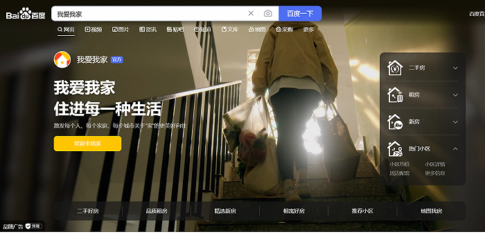 界面新闻5月16日于搜索引擎查询我爱我家时发现,目前官网信息条显示“住进每一种生活”的品牌宣传片,以及已更换成新版logo。