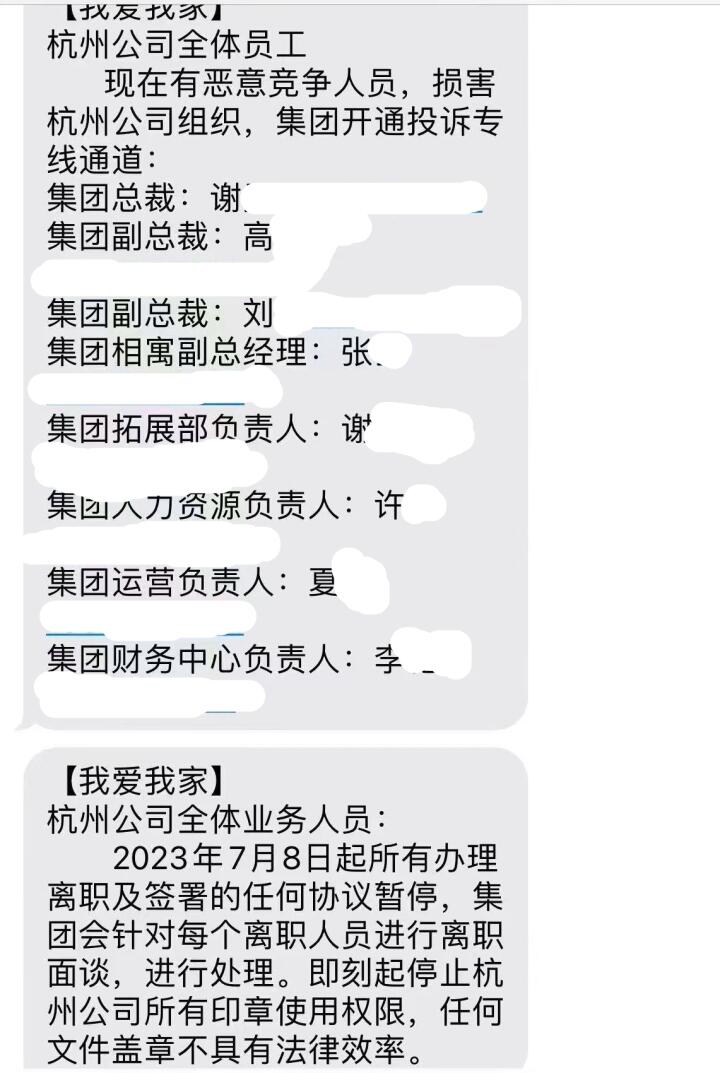 7月8日下午13时,杭州我爱我家全体员工收到了公司群发的短信,措辞严厉,如“行业恶性竞争”、“恶劣手段破坏性挖人”,并宣布大批杭州公司高管停职。与此同时,短信中还发布了各层级员工的“涨薪”计划。