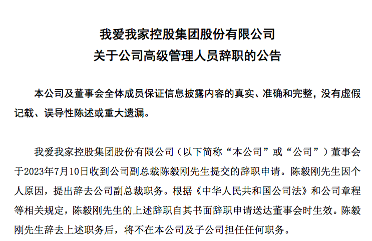 7月10日消息,据我爱我家今晚发布的公告显示,该公司董事会在2023年7月10日收到公司副总裁陈毅刚先生提交的辞职申请。陈毅刚因个人原因,提出辞去公司副总裁职务。