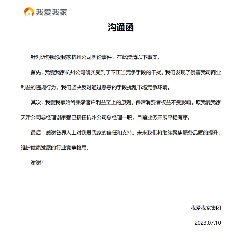 就在今天,我爱我家公司向媒体发布沟通函时宣布了杭州公司新总经理的人选:“原我爱我家天津公司总经理谢家强已接任杭州公司总经理一职,目前业务开展平稳有序”。