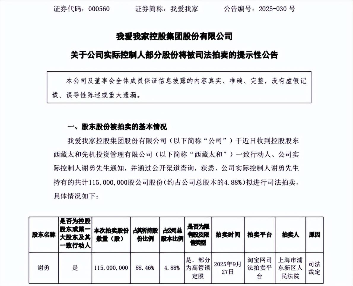 据最新披露信息,谢勇持有的1.15亿股将于9月27日在淘宝法拍平台公开拍卖,起拍价约为3.16亿元。这场司法拍卖的缘起,乃是一位上海同乡倪某的债务纠纷申请。