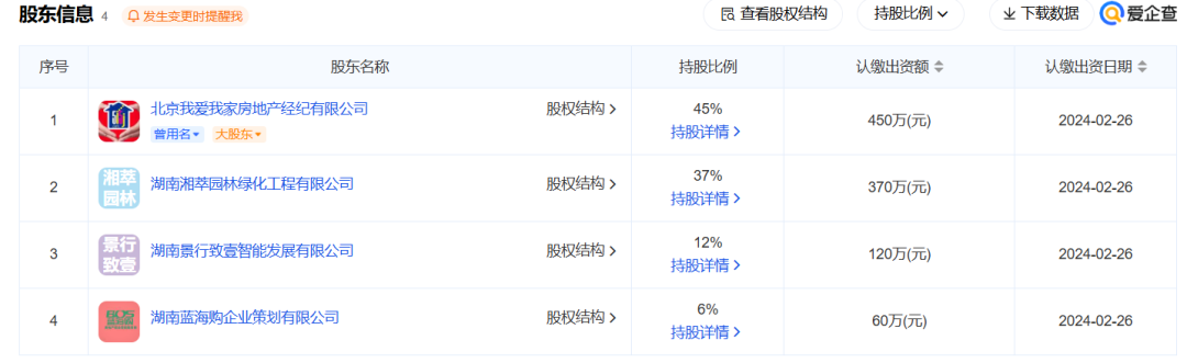 2024年2月,新增股东湖南蓝海购企业策划有限公司(下称“蓝海购”)。彼时,蓝海购仍为我爱我家全资子公司。