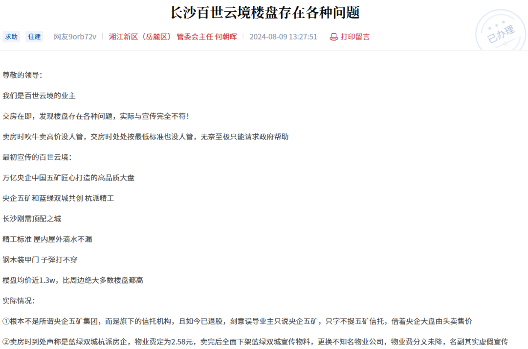 在问政湖南平台上,百世云境累计有70余条投诉。