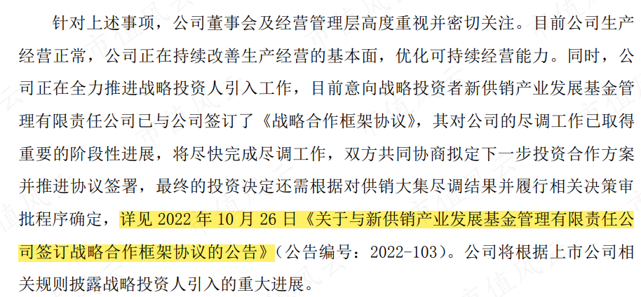 其实这里面也不全是运气,毕竟上市公司总是时不时就提一下自己在2022年10月26日,与新供销产业发展基金签订的战略合作框架协议。